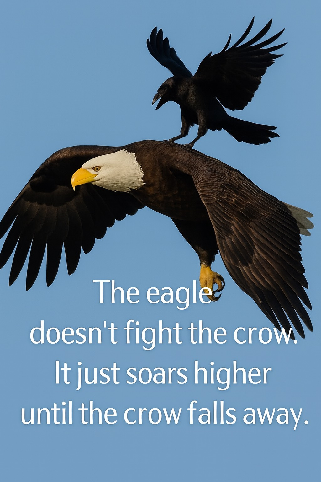 The air thins as the eagle ascends. The crow can’t handle the altitude. Eventually, gasping for breath, it falls away. The eagle didn’t have to attack; it simply soared to a place the crow could not follow.